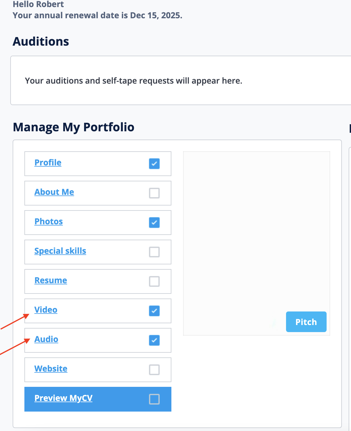 - On your home page, under "Manage my Portfolio", select Video or Audio.