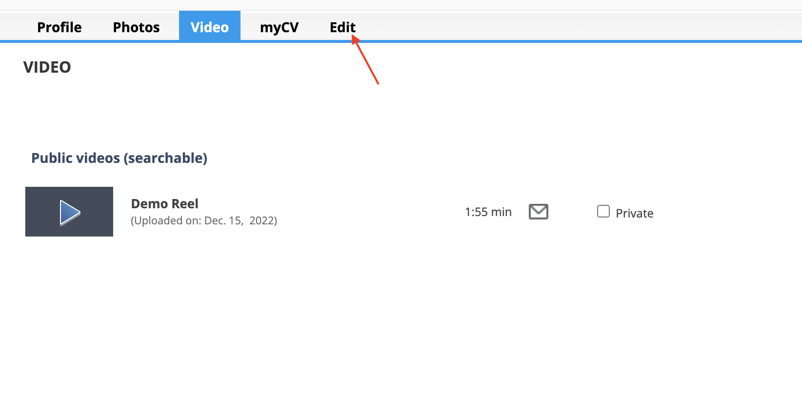 7. Once the media has finished uploading, you can make the clip viewable by agents & casting by deselecting the tick-box in the Private column.